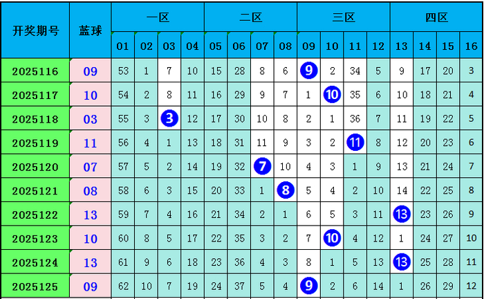 上期蓝球开出号码09,近十期蓝球在一区开1枚,二区开出号码2枚,三区开出5枚,四区开出2枚,区间比1:2:5:2,本期推荐蓝球出现在四区,重点关注14。